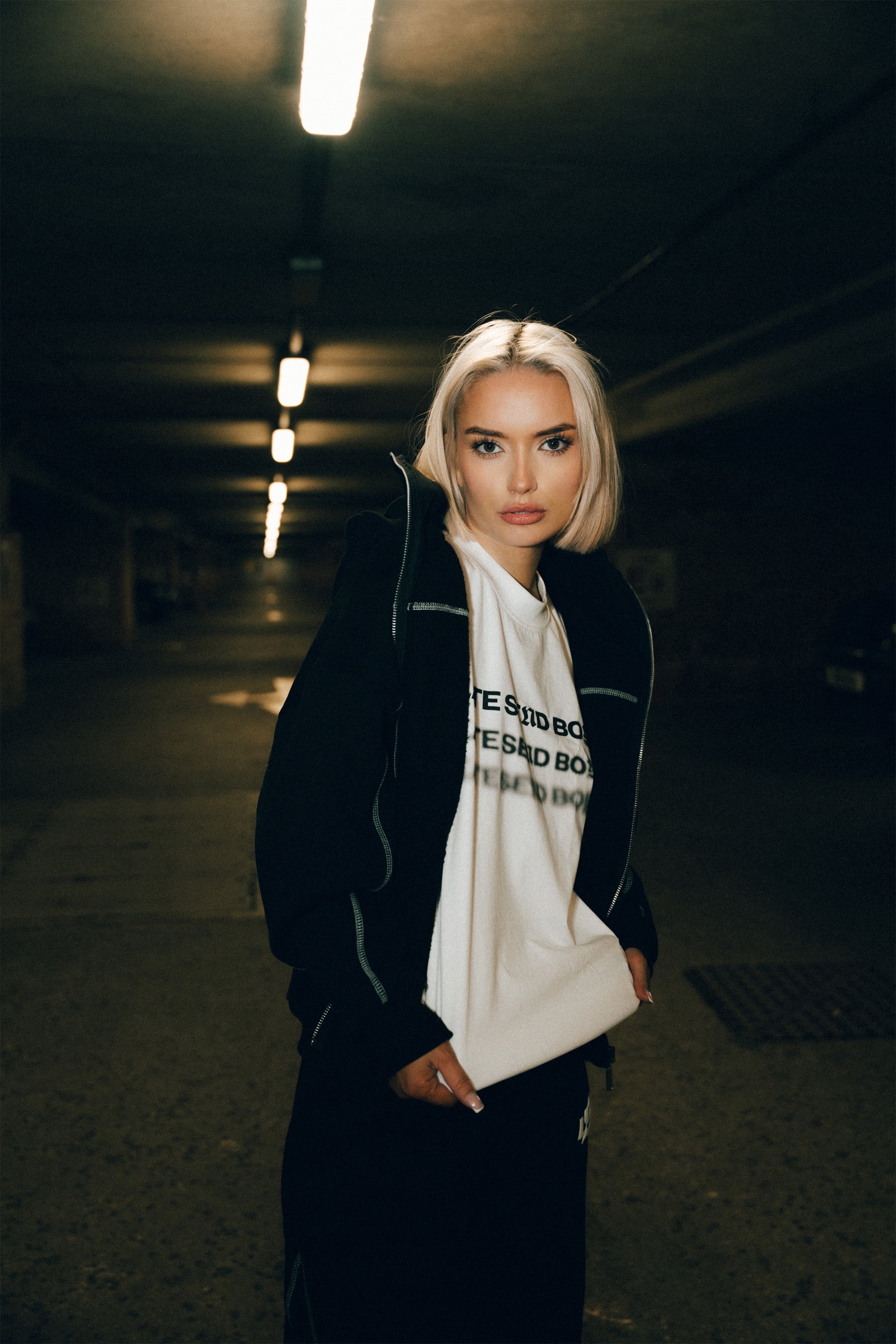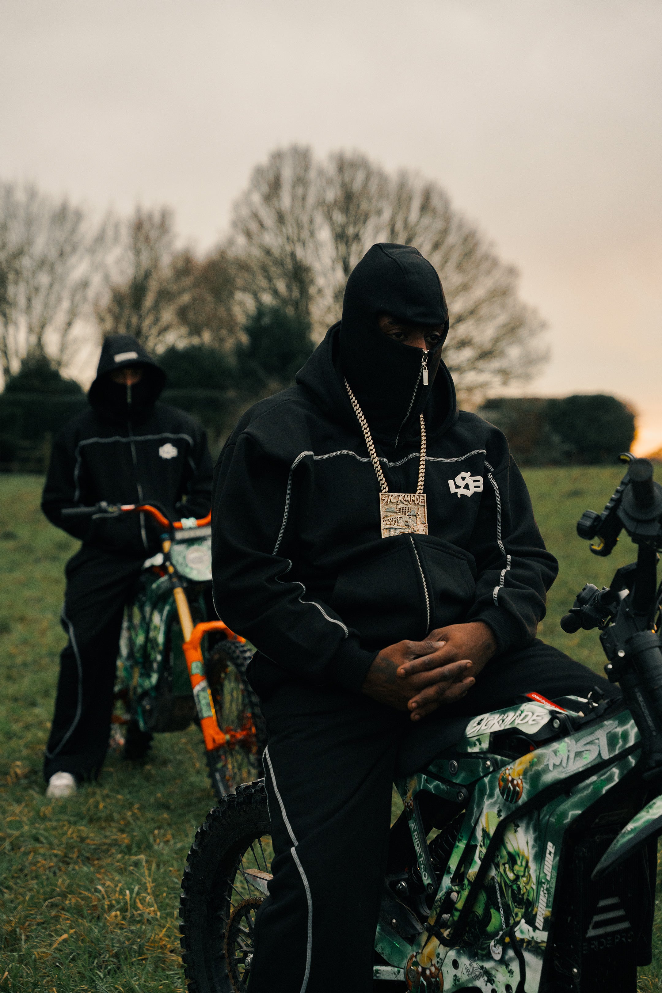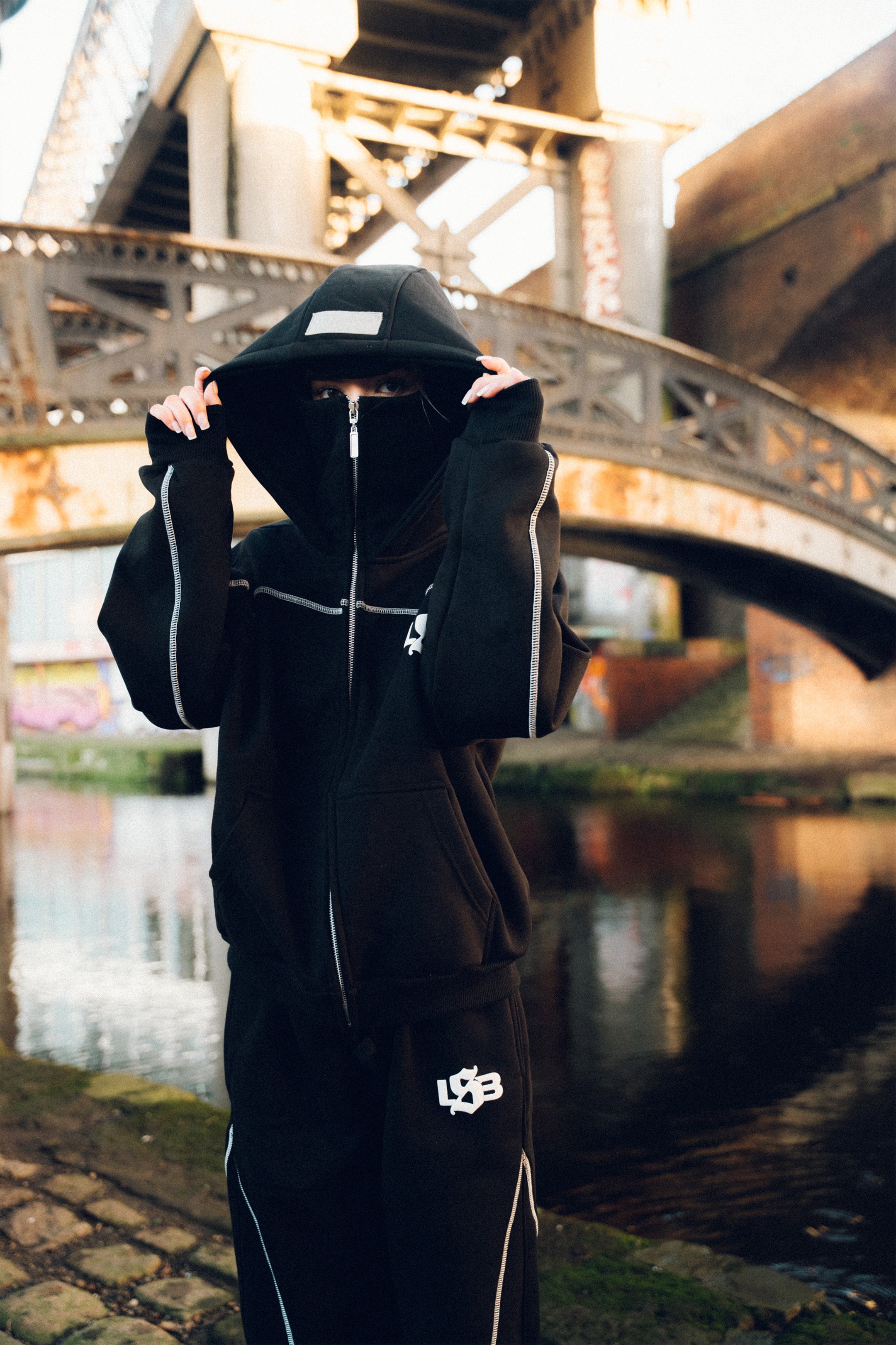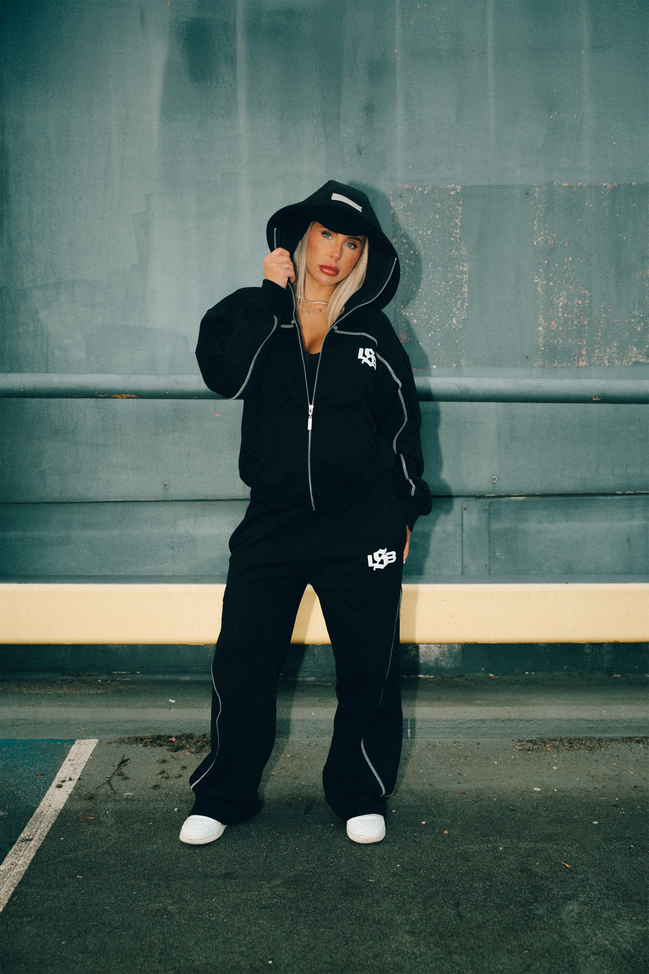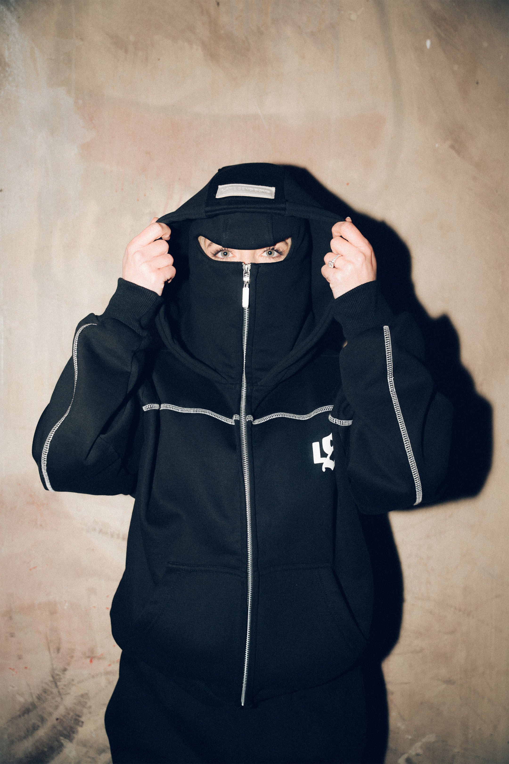 Built for late nights, cold starts, and moving like you’ve got somewhere to be. The Balaclava Set pairs a heavyweight hoodie with an integrated balaclava hood and matching joggers for a clean, locked-in silhouette. White contrast stitching cuts through the black for that sharp, engineered look, finished with raised puff print front and back.